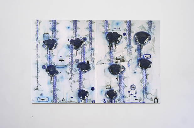John Pule has made four new paintings for the occasion, each embodying a different poetry of blue. In Hopo Viki pools of blue enamel paint bleed with turpentine, their edges stressed and eviscerated. At these edges paint is sometimes wrinkled skin deep. At other times varnish is poured on, and delicate surfaces transparent and luminous like jellyfish are achieved. In Moheaga, white paint is run into matt blue, realizing crazed marbling effects like peacock feather, or lines that rest nematode-like in the belly.