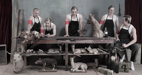 But back to Bloodlust - just what have we got here? A tableau - a meticulous horizontally arranged menagerie of male flesh and dead animals. All grouped in and around a big bench - a shallow space full of detail, with chalkboard and a series of formula like thoughtforms just behind. Dark red drapes curtain some edges like a stage, as in Teamwork (below). Aspects of the composition are like a Last Supper, except that here there are more stuffed animals and guns. Then we learn that the chemical equations behind include the molecular drawings for testosterone. I look at the young men, consider the artist's titling, and begin to wonder.