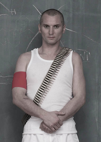 Take six male models (from a local rugby team and gym) and a stylist - for consistency of hair, make-up and dress. Gather many carefully chosen props. And assemble in the photography suite at the Southland Institute of Technology. The artist here is literally director - a role she has played in the past, where she has photographed first, and then gone on to make a series of closely related paintings later.