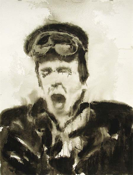 In Gets you right down to your soul, a harlequin-like figure stands in a dark ground. His dry-brushed features and colourful clothing are light touches alongside areas of raw linen. The background by contrast is a marvellously layered dark violet expanse wrought in wax, and then scratched and abraided with white. This is a worked surface full of history. Figure and ground merge easily through whites and reds around the winged hat and head. It is a very handsome painting, soft and bruisingly assertive at the same time.
