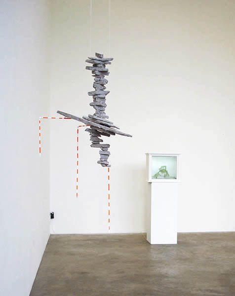 In Calling the Deep, Jo Langford stacks thin fragments of cast cement with precarious balance and great care. She builds up considered complex structures, little temples of thought. Some are suspended, their weight floating elegantly in space. Others stand on the floor. And then she takes our attention to what might be beneath.