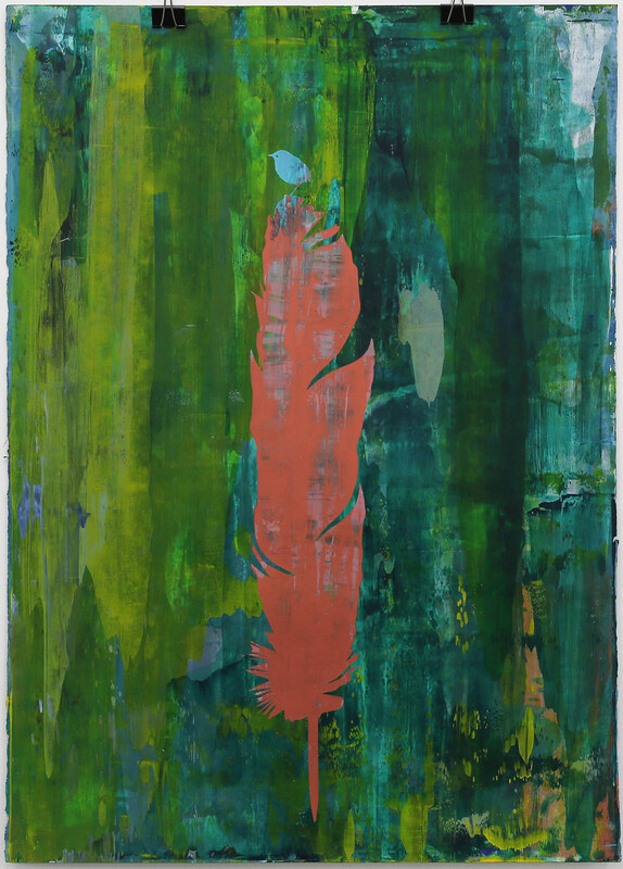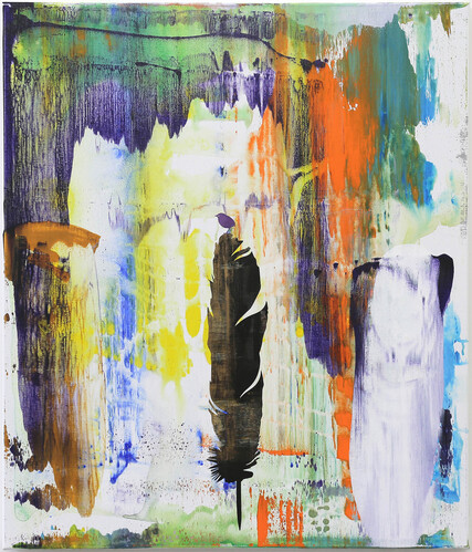 Chris Heaphy’s new show, Everyday Life, has a remarkable fluidity about it. Richly coloured pours of acrylic are pushed and pulled over the teeth of Belgian linen with terrific confidence – with a degree of facility you’d expect after three decades of painting. His visual vocabulary, including Maori heads, birds and feathers is present still, but is now part of the wider fabric of the painting itself – part of the fluid dance between painted ground and material support. Spatulas have pulled paint both horizontally and vertically, sometimes when wet, sometimes when a little drier. And the motifs of bird and vase have been treated with great consideration, sometimes integrated with that which surrounds them, and sometimes quite deliberately not. The feeling is almost other-worldly. But the man’s an angler, a conjuror of dreams – so we would expect this, of course.