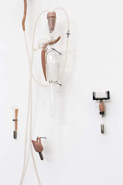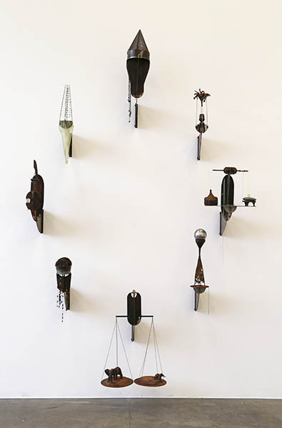 Things yet to be named is a new work, with steel brackets that like ancient boat prows seem rusted by the ravages of time. Hung in easy rhythm as compass points around the wall, each stand offers a mysterious tableau. Domestic objects including strainers, funnels and threads are combined with a touch that is intimate, poetic and industrial. The work feels enigmatic and timeless - Byzantine almost. And Things seems just balanced but also in need of ongoing process.