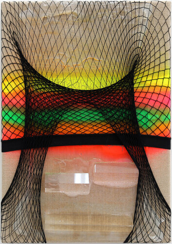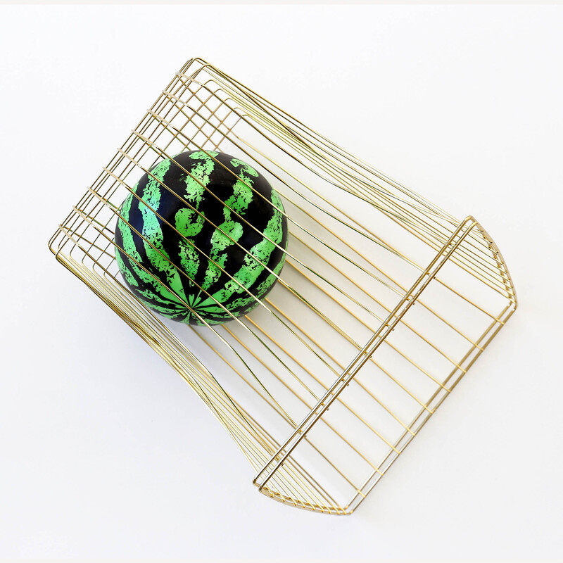 The line of Bin Works (or “has-bins” as she calls them) are material delights – or the sum really, of what happens when you place objects like a rubber melon or imitation log in a metal bin and squash them. In Mesh 1 & 2, Darragh does things with net stockings, crystalline prisms and fluoro paint that you may not want to know about. And works like Heal and Melt are almost disarming in their striking simplicity of form and materials, right down to their colourful choice of plinths. Boil Up really is over the top with its superheated red sheepskin support.