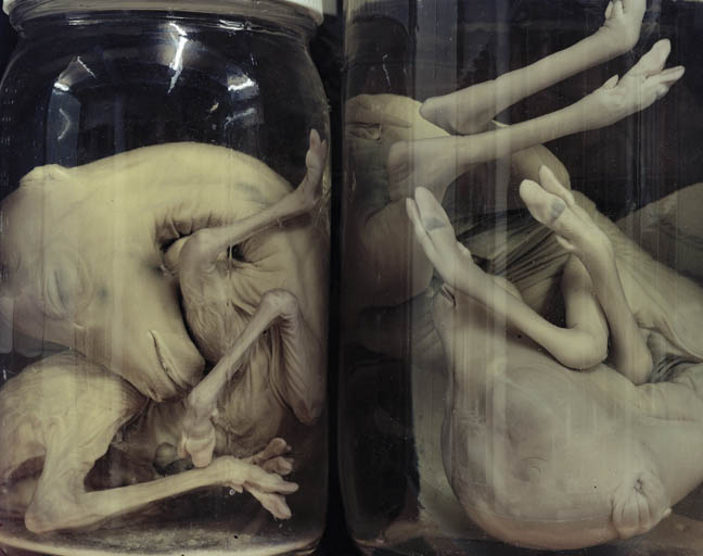 Photographs from the Wet Room at Otago Museum, exhibit a slightly different feel. Wet Room #2 offers the detail and care of placement typical of still life, whereas Wet Room #1 shares some of the Gothic qualities of Quattrocento Dutch painting. The colour of the tiny deer specimens and their cramped angularity recalls the grotesque in Flemish painting, while the thick, tactile quality of the glass that encases them adds richness and suggestion.