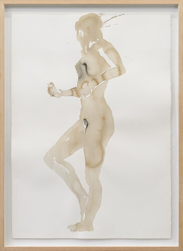 The drawings on the wall behind look similar in form - upended and seemingly falling to the floor. But they have terrific presence. Drawn in blood with a goat's hair brush (then varnished to seal and set the colour), their outline, their use of negative space, and the way pockets of blood are allowed to pool, very sensitively describe the female form. Along with a drawing in grey ink which is wetter in application (and somehow more threatening and vulnerable in feel), these paperworks are utterly compelling.
