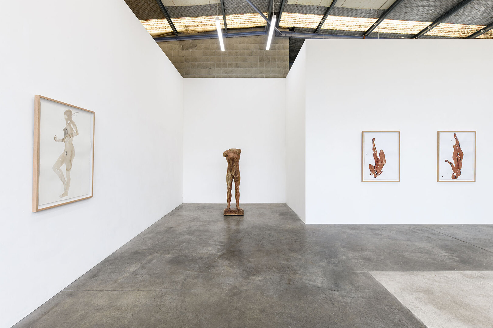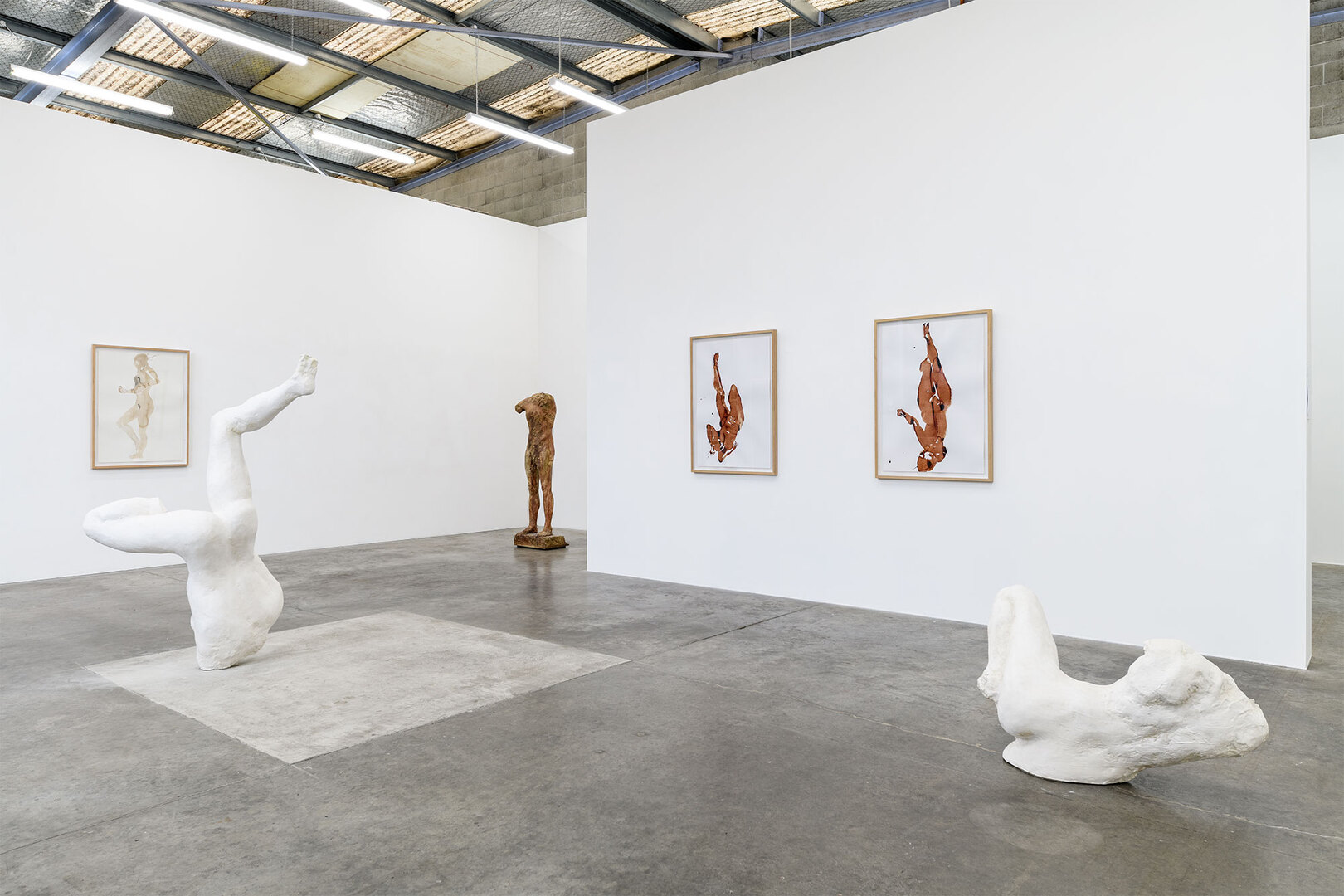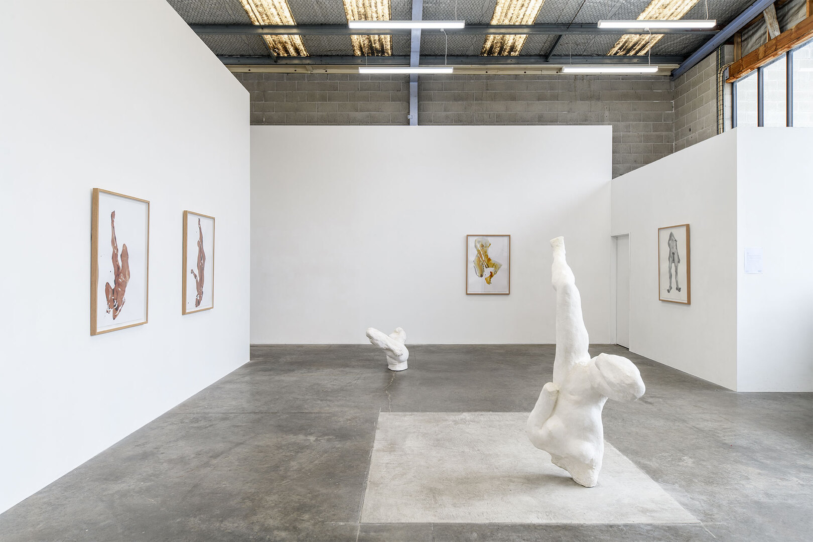 In this new exhibition the title work Upended, is a female nude modelled in white plaster presented upside down. The sculpture is balanced on the point of a shoulder with one leg upright, and the other folded in a right angle from the hip. The pose is powerful yet prone, and the modelling tender - there being both grace and heft in the strength of this inversion. It is playful, vulnerable and mighty strong.