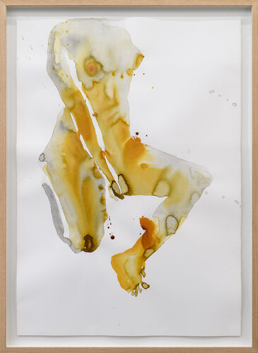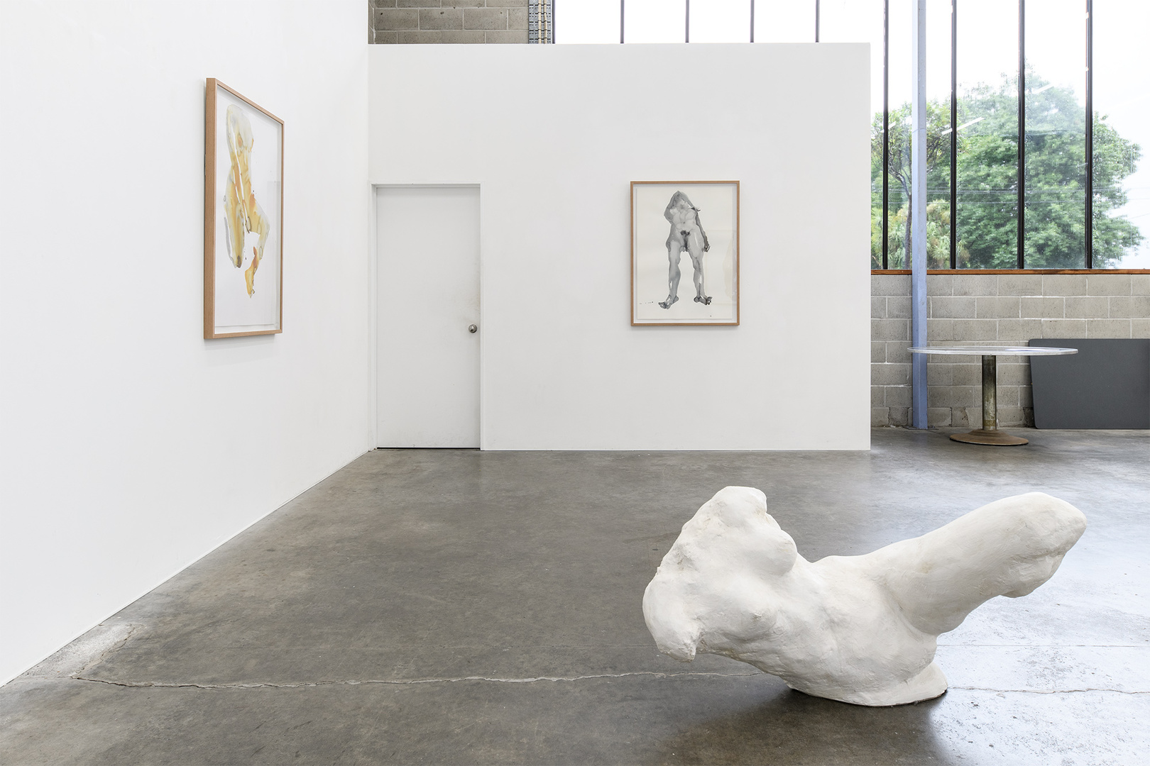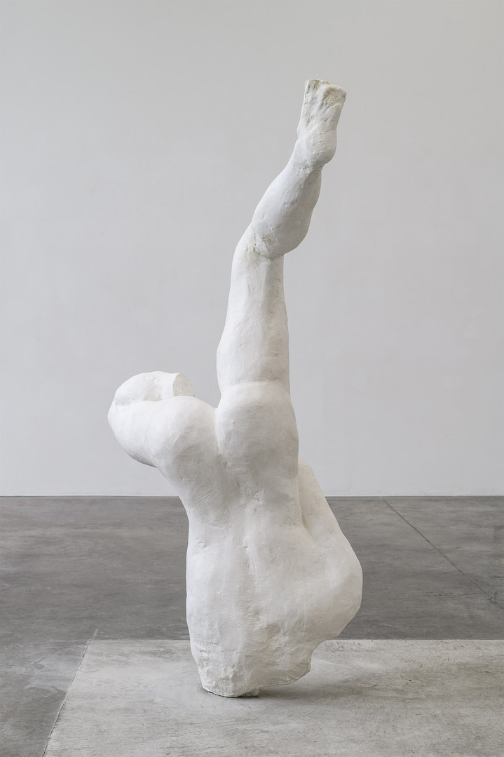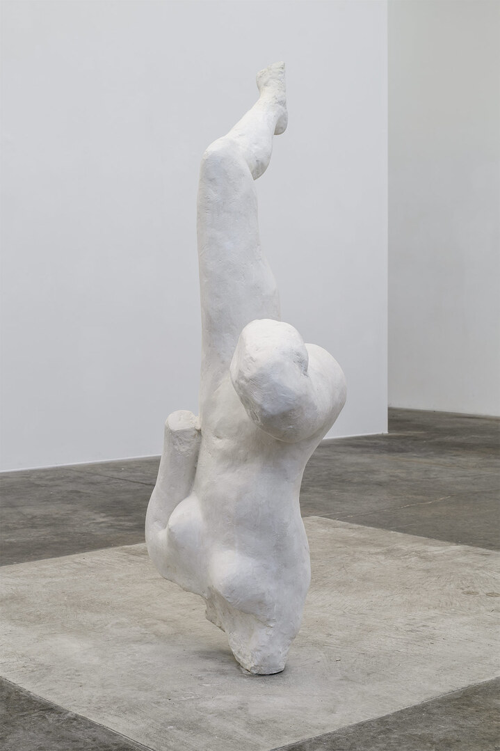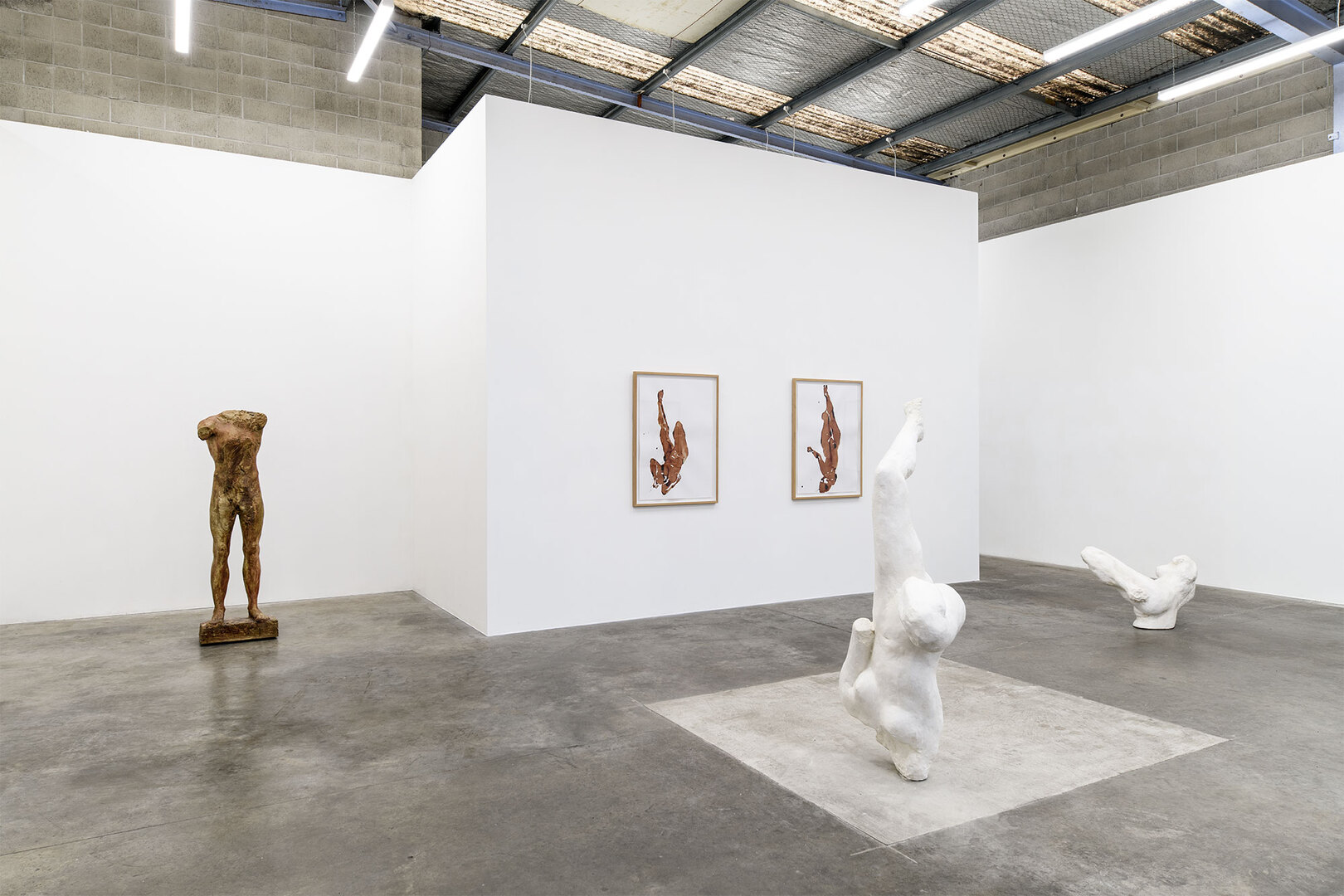 In this new exhibition the title work Upended, is a female nude modelled in white plaster presented upside down. The sculpture is balanced on the point of a shoulder with one leg upright, and the other folded in a right angle from the hip. The pose is powerful yet prone, and the modelling tender - there being both grace and heft in the strength of this inversion. It is playful, vulnerable and mighty strong.