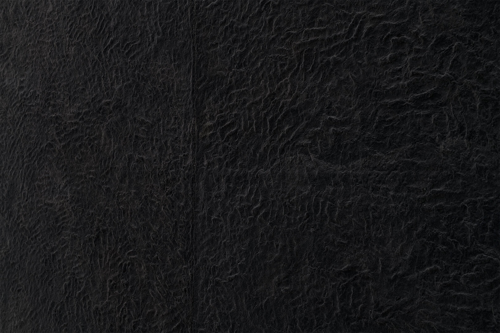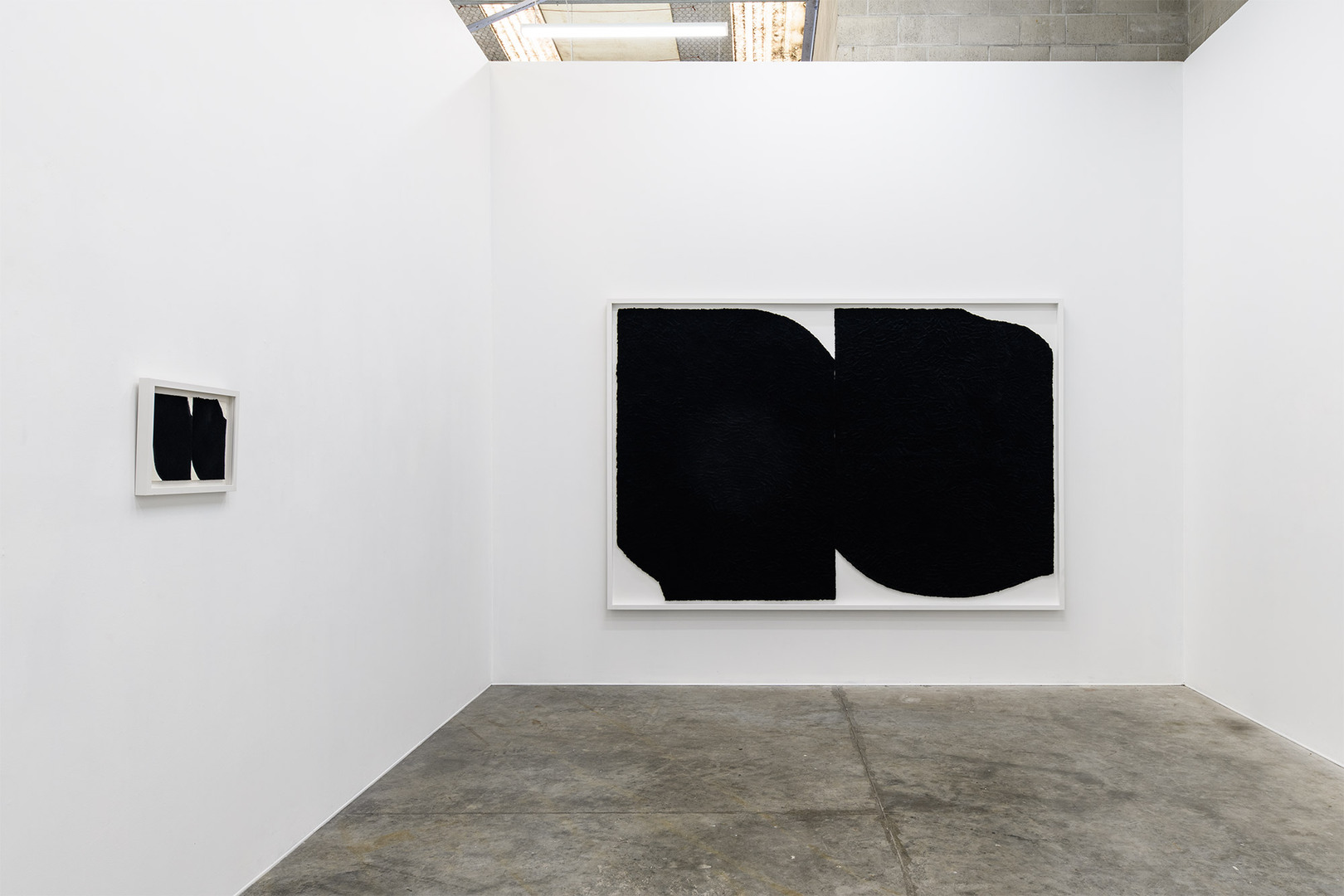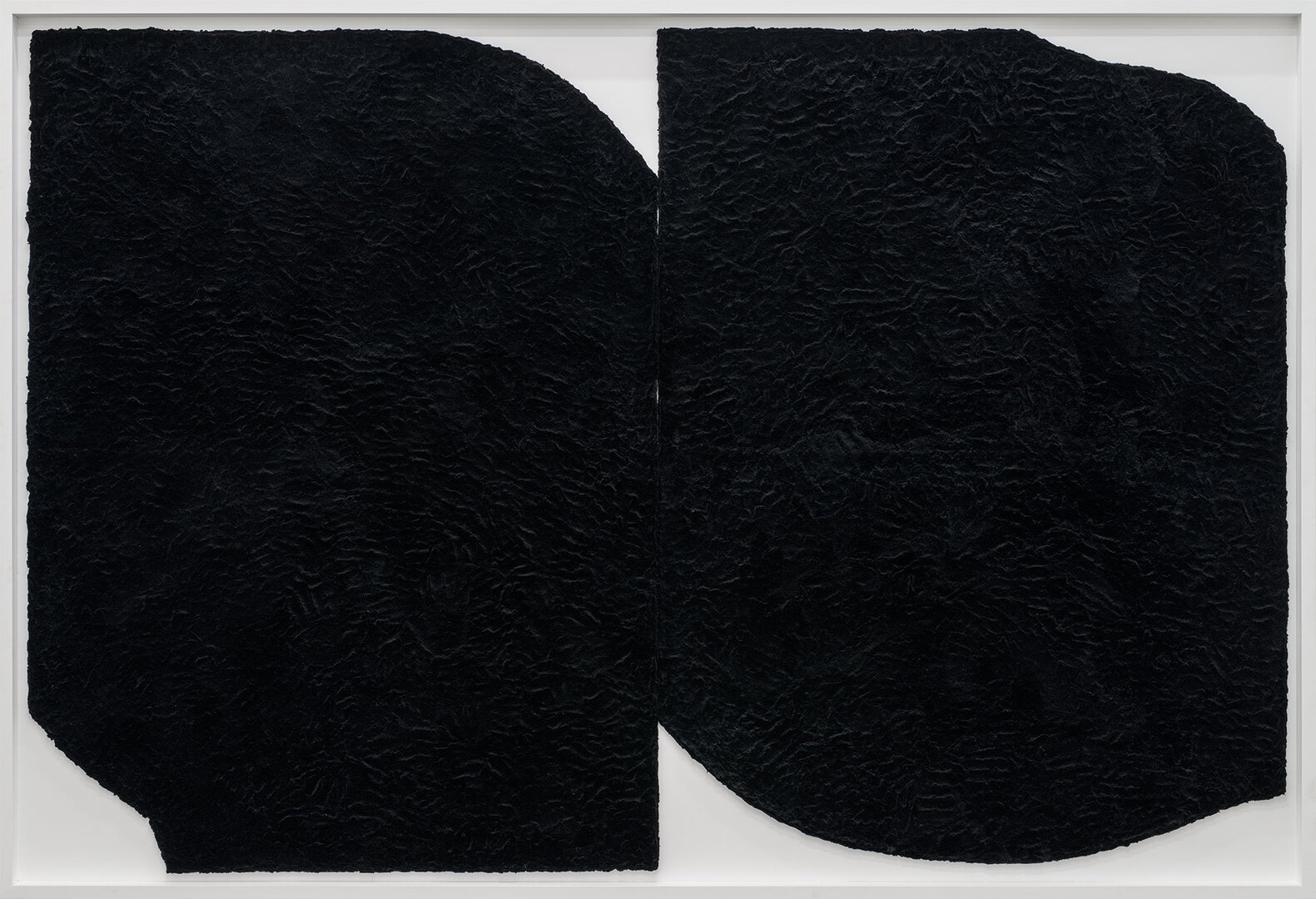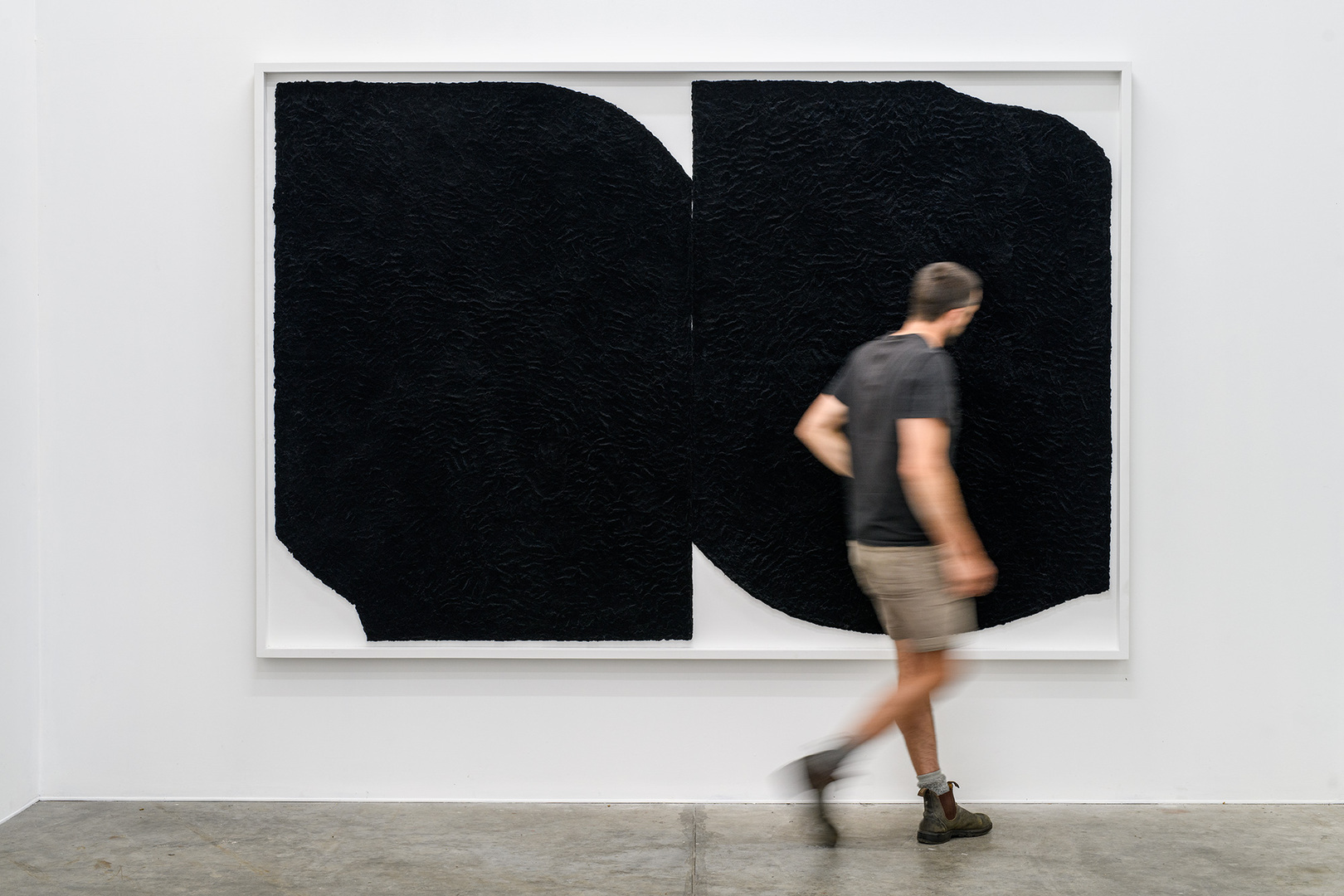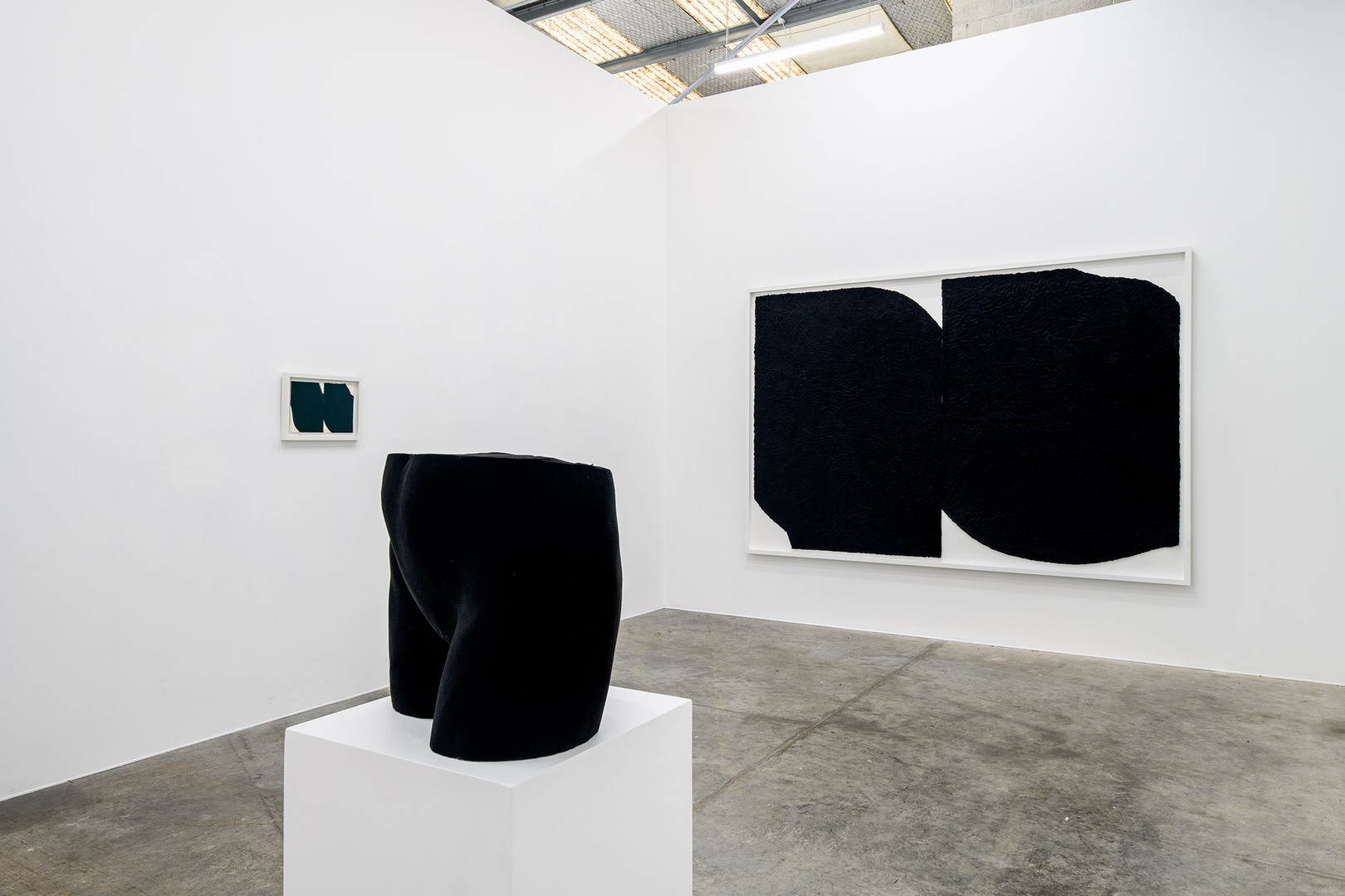 The three works in the back Gallery are delightfully different. All are black with very little white. And form, modelled here in pulped flax as well as plaster, is flocked black - a rendered surface that absolutely eats light.Harrison takes the contour of the female buttock, beautifully elegant in Cropped Torso (Upended), and grows that curve into a monumental wall work, Untitled 7. Dark, dense and tactile, this abstraction from the human form is commanding from distance with its scale, whilst up close the texture of the flocked ground ripples like a landscape and shivers like goosebumps on flesh.