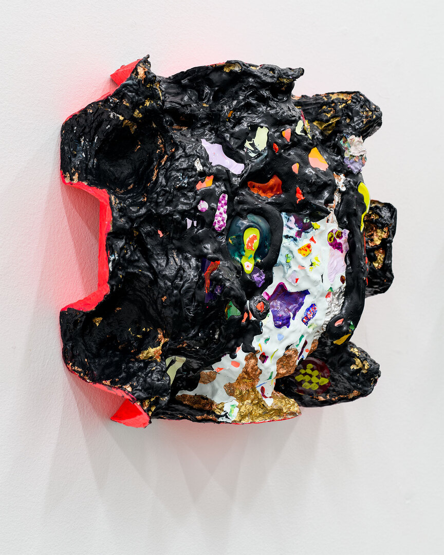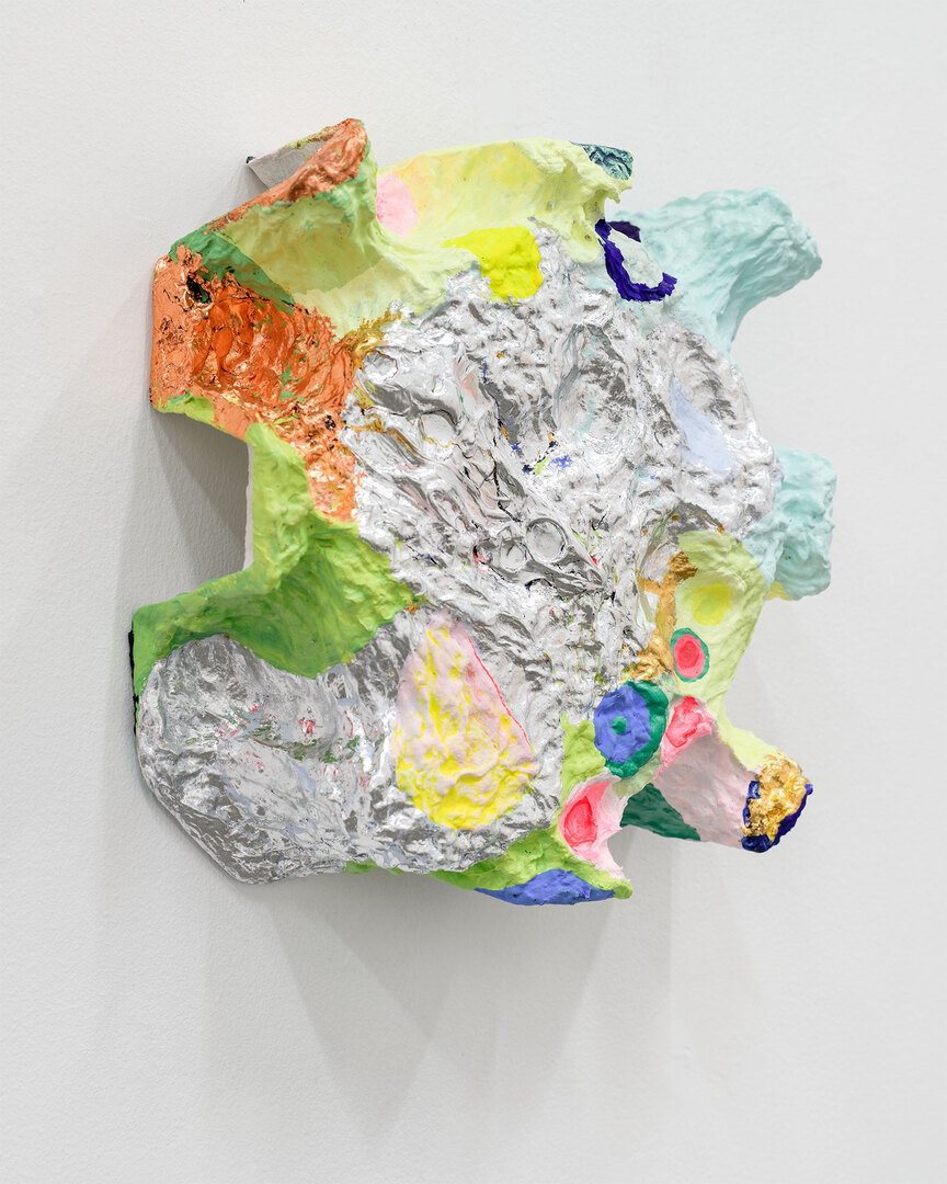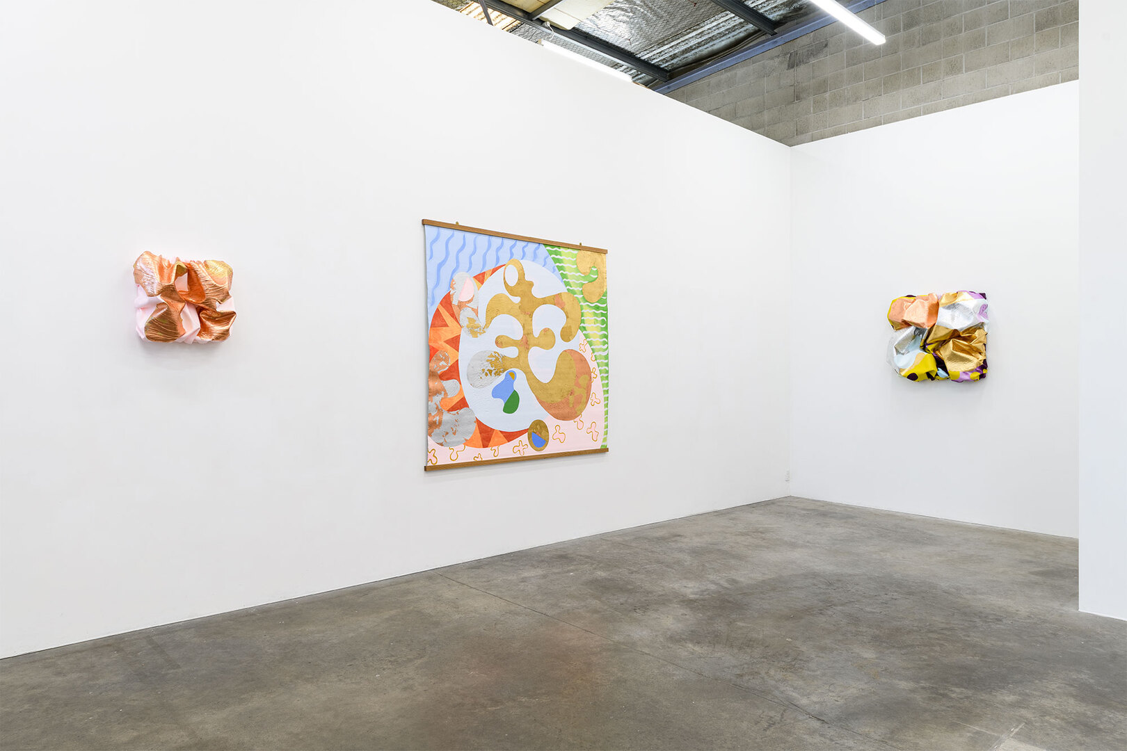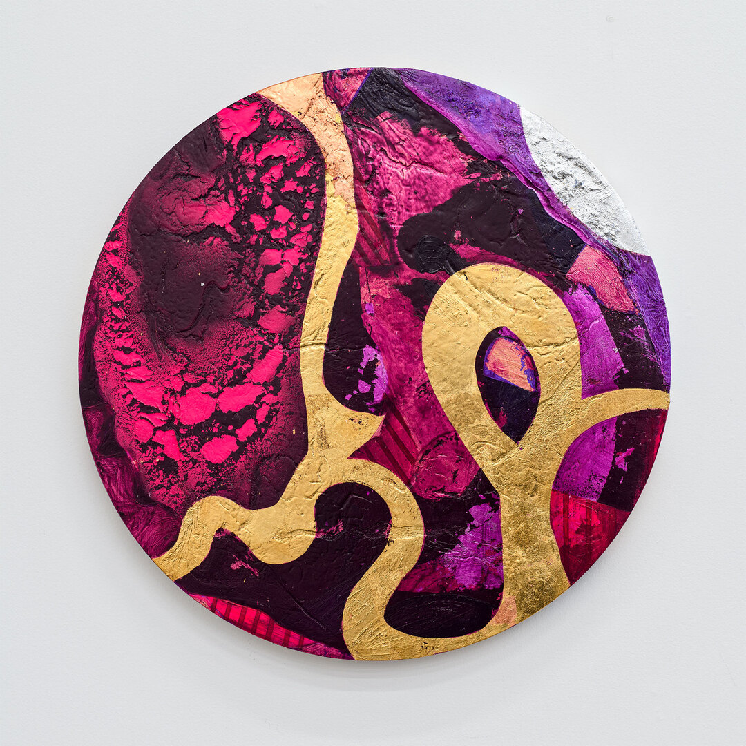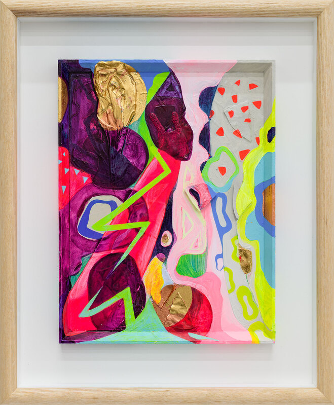 Palette-wise, rewilder continues Parkes’ recent combination of fluoros with metallics. But there are hues of mustard and brown in livestreamer, for example, that she has not used before. Importantly, in livestreamer colour is brushed thinly with attention to edge, and the reveal of the canvas support – which is very different from the thick impastos and plummy reds and violets in board paintings like performer and shadow-worker.
