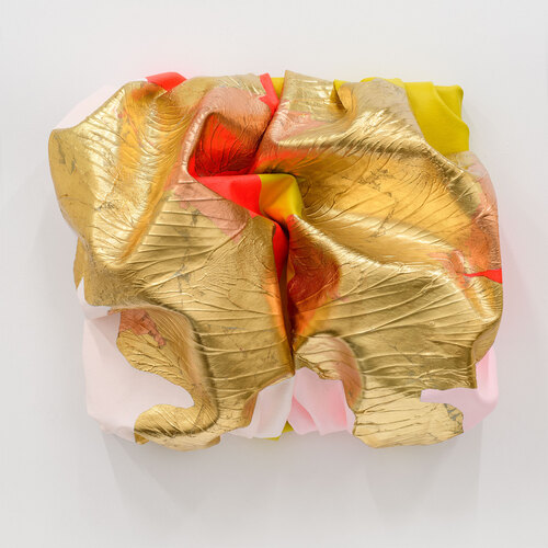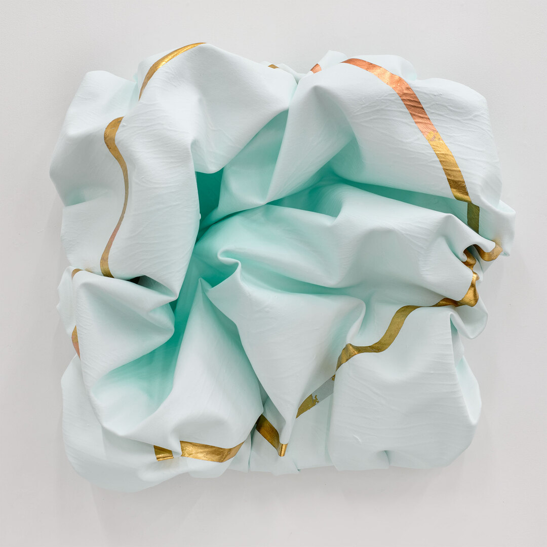 Parkes enjoys the variety. One constant however are the crumple paintings, painted flat then compressed onto stretchers when almost dry. These pulse with energy and life. No stripes this time, but more texture and layering of paint. Copper, silver and gold metallics shimmer in shallow depths. The billows are sensate and intimate – a joyous bodily embrace.