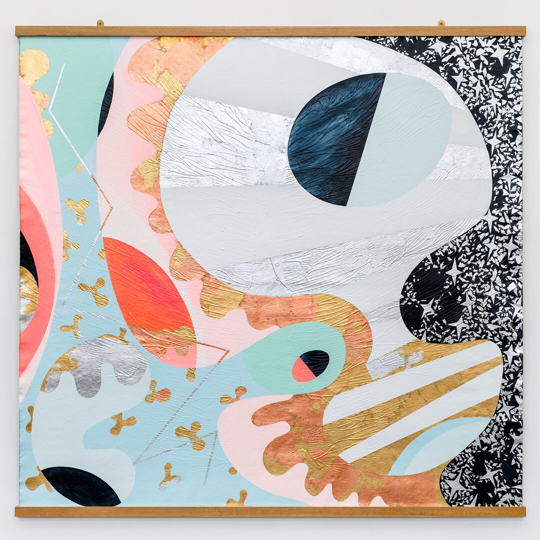 acrylic, metallic leaf and varnish on canvas with oak baton frame
