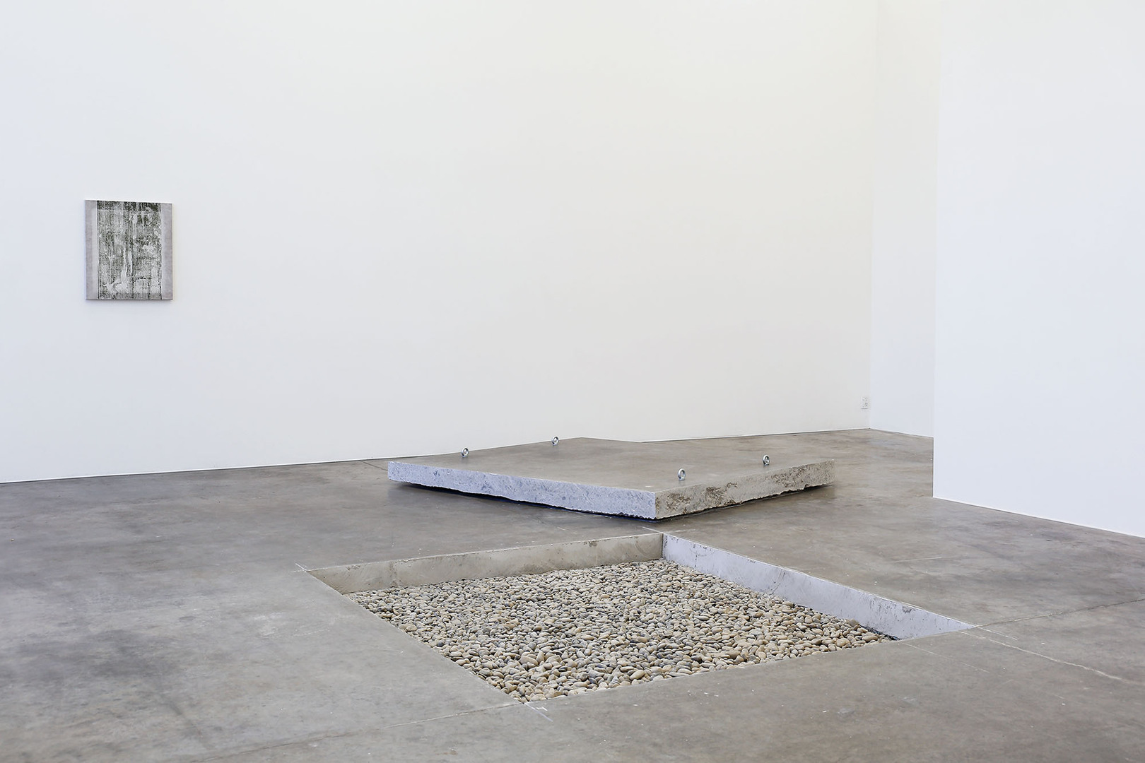 In unmersion, the shallow space of painting rubs up against the direct and physical intervention of sculpture. Fascinating that Tjalling de Vries, painter, should have recourse to such heavy lifting. Cleaving, raising, then placing a one-and-a-half-ton slab of concrete floor to reveal round stones beneath is quite something. Though massive, it looks drop dead elegant and feels delicate even.